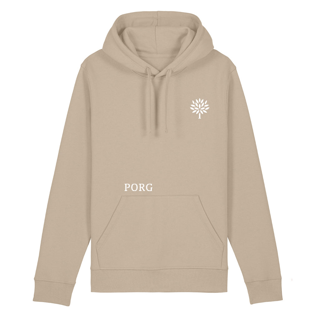 Mikina PORG s vyšitým stromečkem a logem školy. Písková barva mikiny. Klokaní kapsa, kapuca a tkaničky na stažení.