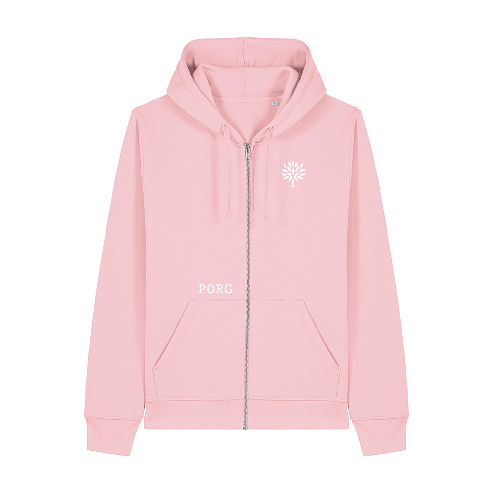 Růžová mikina na zip s kapucí. Dvě kapsy ve předu, šňůrky v barvě mikiny. Logo PORG vyšité v bílé barvě.