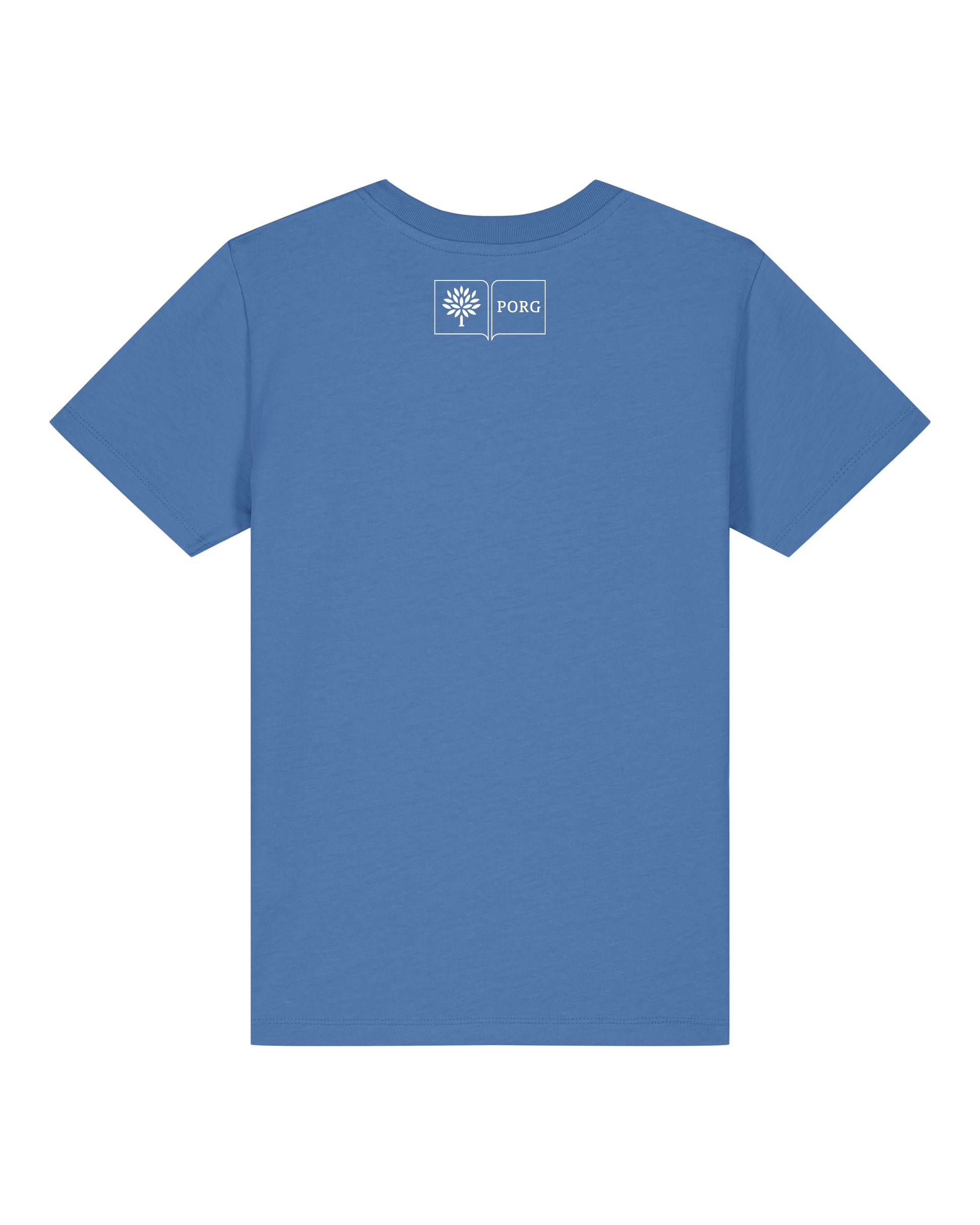 Dětské triko modré barvy. Vpředu velký tisk stromu PORG, vzadu malý tisk loga PORG.