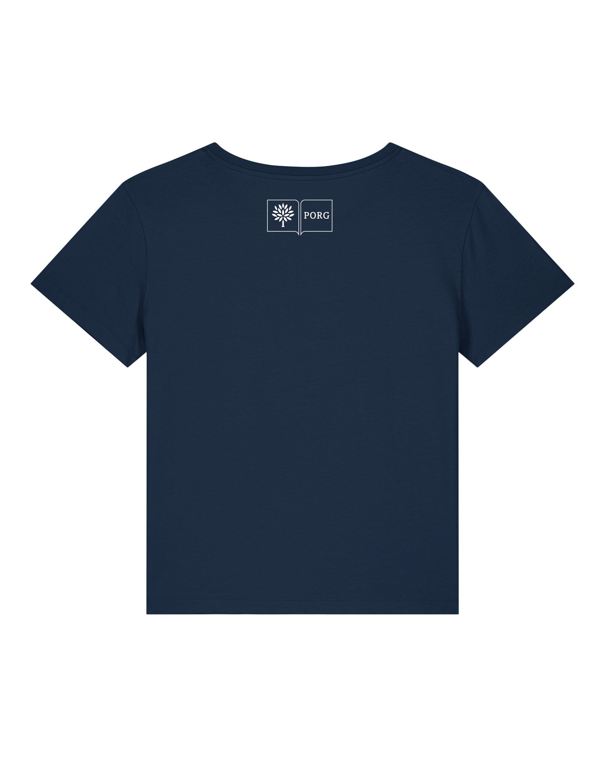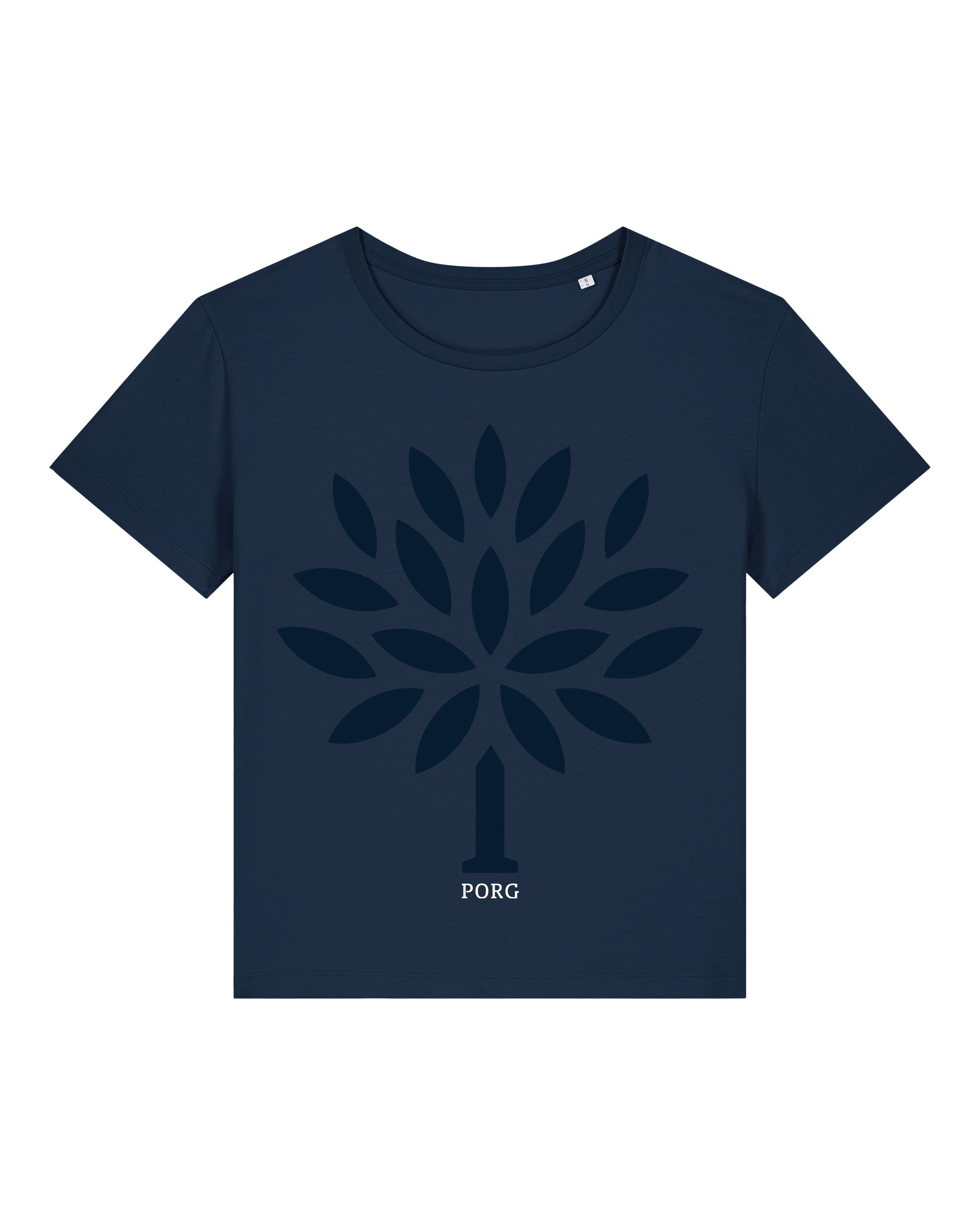 Dámské triko s potiskem velkého stromu tón v tónu a PORG nápisem. Na zádech malé logo knížky PORG.