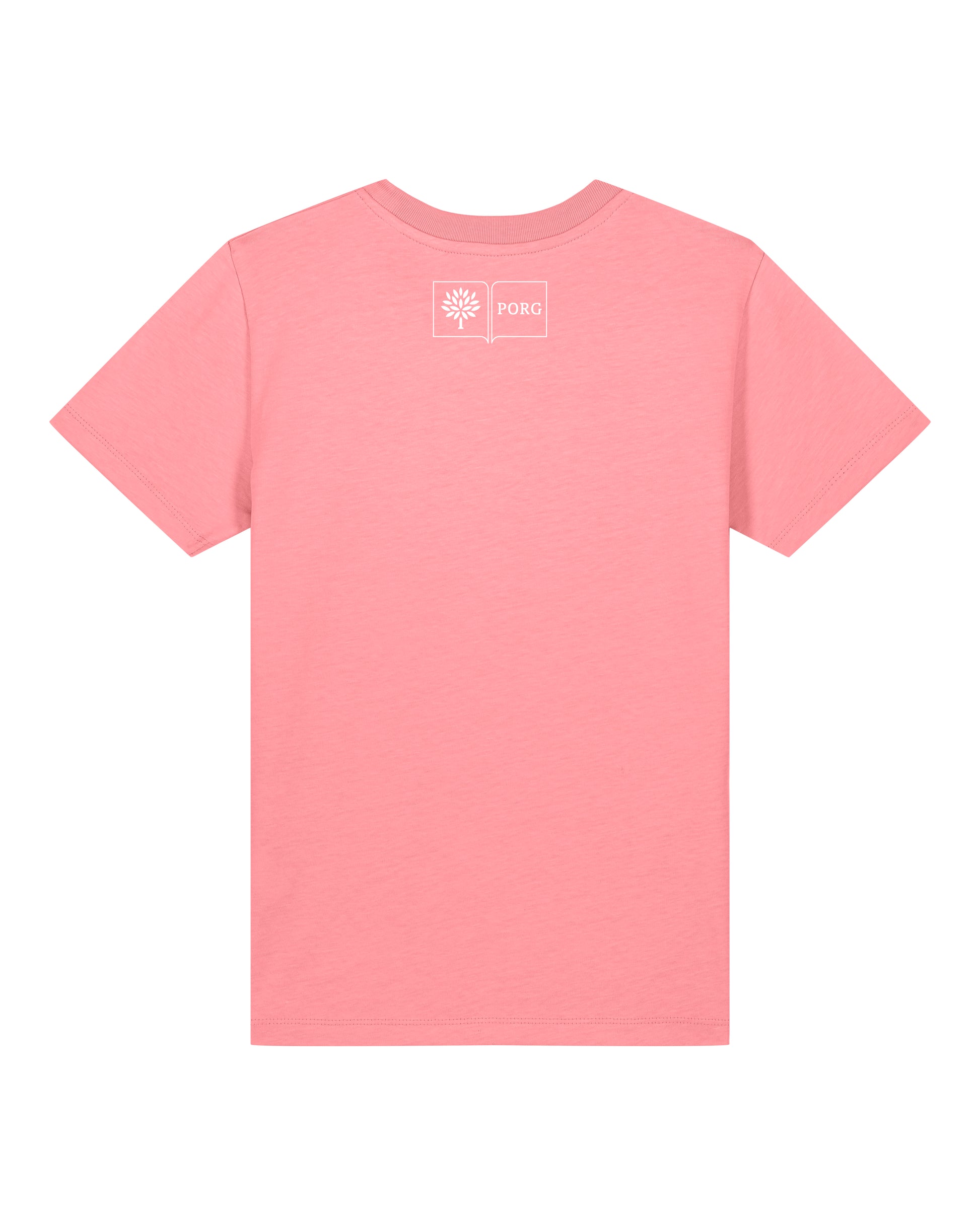 Dětské triko růžové barvy. Vpředu velký tisk tón v tónu stromu PORG, vzadu malý tisk loga PORG.
