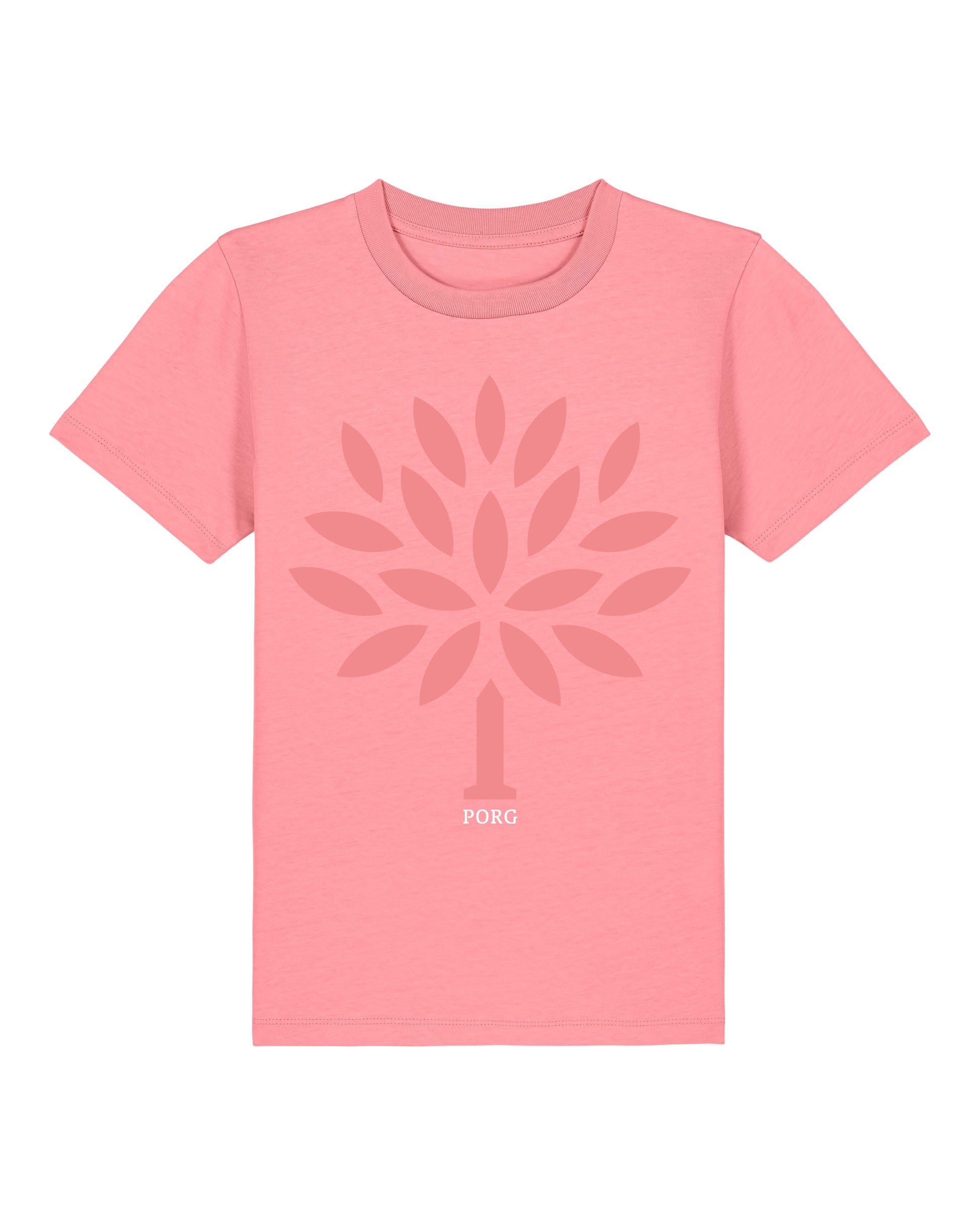 Dětské triko růžové barvy. Vpředu velký tisk tón v tónu stromu PORG, vzadu malý tisk loga PORG.