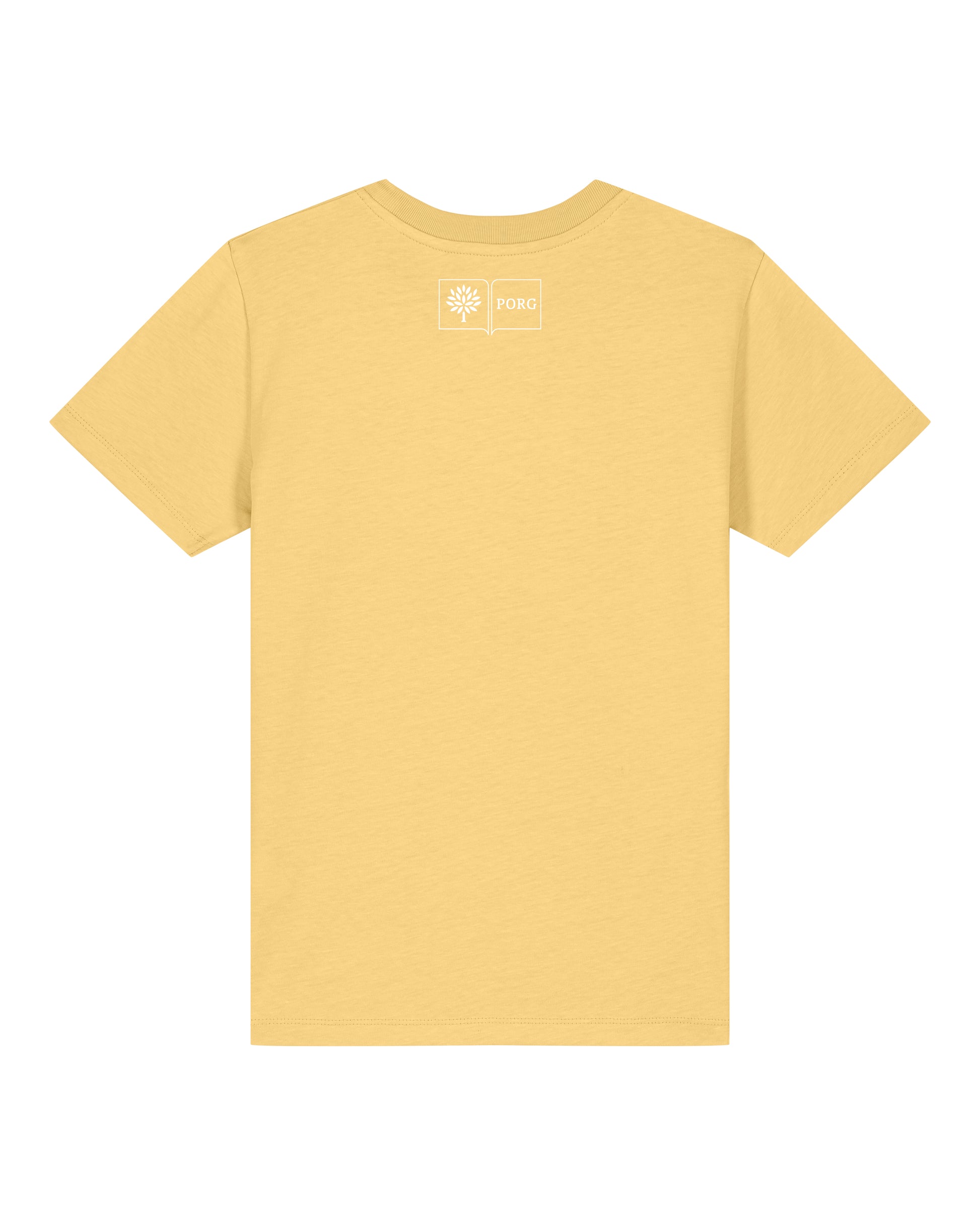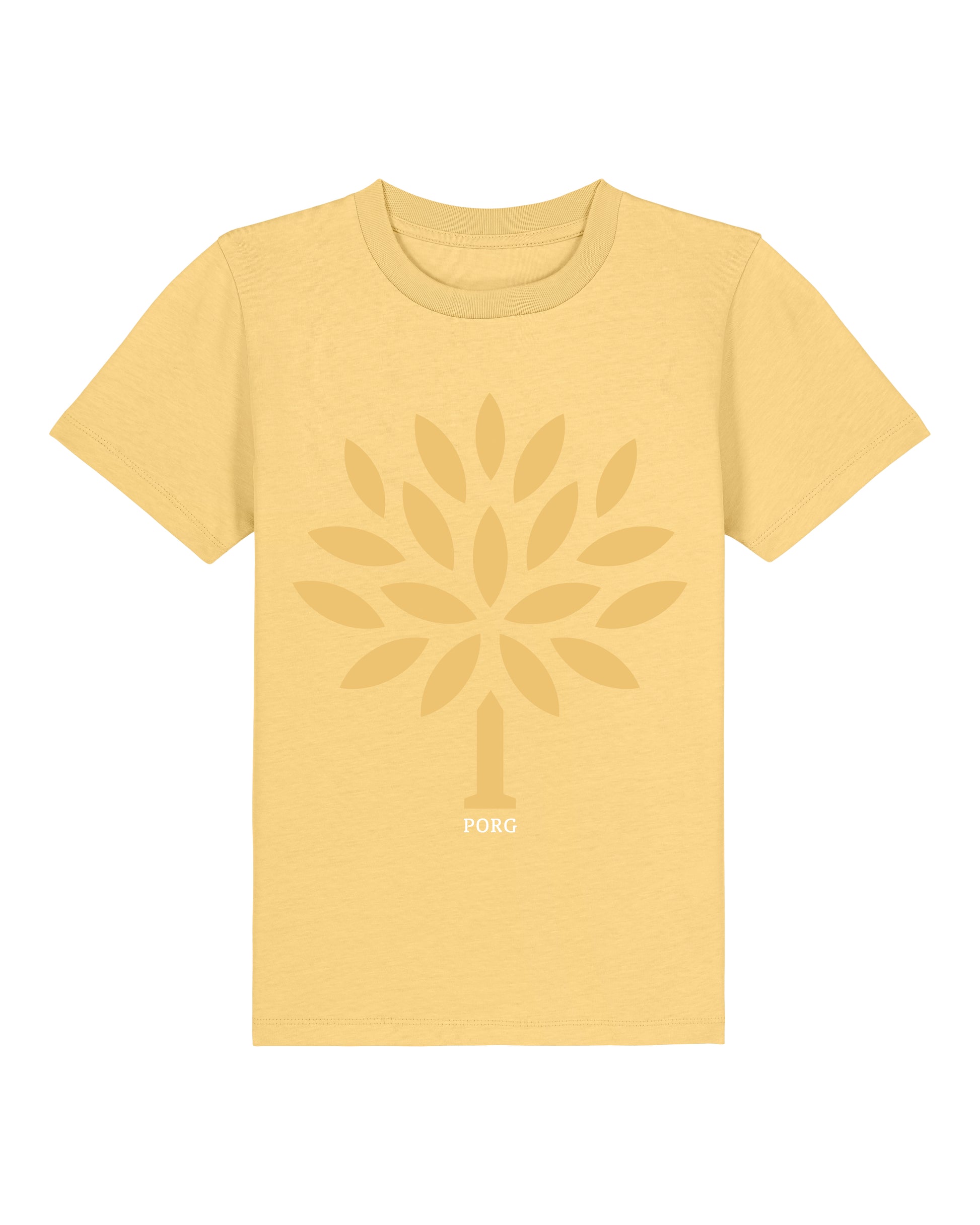 Dětské triko žluté barvy. Vpředu velký tisk tón v tónu stromu PORG, vzadu malý tisk loga PORG.